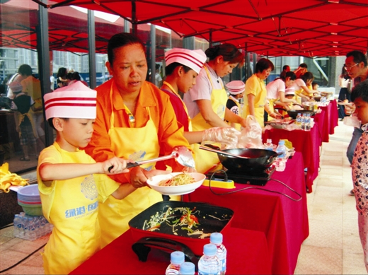 本報訊 昨日上午,南寧經(jīng)濟技術(shù)開發(fā)區(qū)在綠港·國際中心開展了以“關(guān)愛農(nóng)民工·綠港小廚神”親子活動,吸引了南寧經(jīng)開區(qū)園林綠化工人、水電維修物業(yè)工人、保潔人員等300多名進城務(wù)工人員及其子女參加。在活動現(xiàn)場,參賽小選手們在父母的指導下井井有條地備菜、炒菜、起鍋,忙得不亦樂乎。